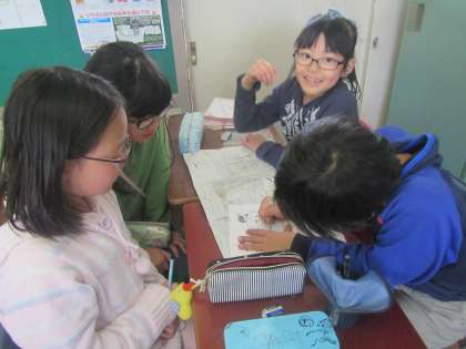 係ごとにあつまって相談し、素敵なポスターを作っています。