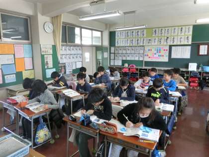 算数の授業では、今日も教室にある身近な円形のものを使って学習を進めました。円周と直径を測り、円周率を求めます。ほとんどのもので3.14に近い値を出すことができました。よく集中して授業に臨みました。