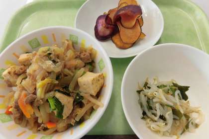 【献立】すき焼き風どんぶり・もやしとわかめの甘酢かけ・さつま芋チップス・牛乳