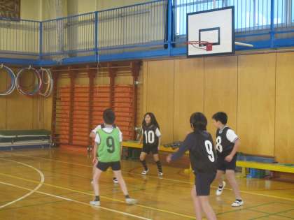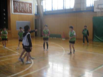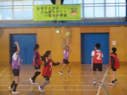 4年生が体育の時間に、バスケットボール型ゲームで汗を流しました。