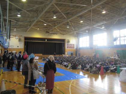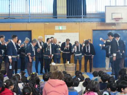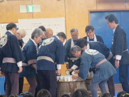 大先輩の説明と餅つきに、喜ぶ若小の子たちです。