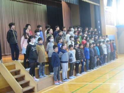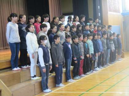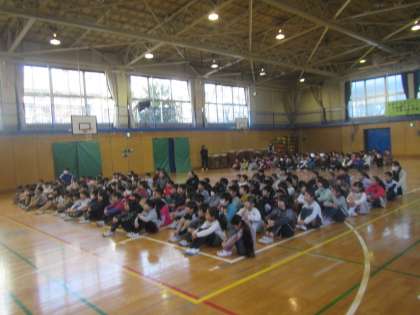体育館に集まった全校児童を前に、堂々とした暗唱です。