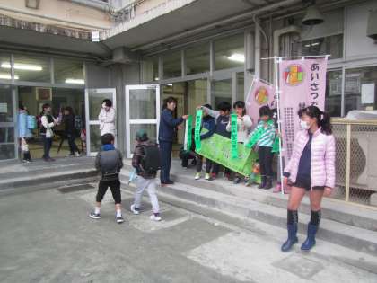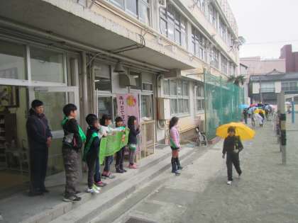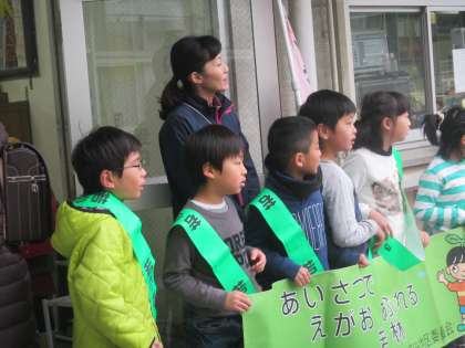 小雪のちらつく中でも元気いっぱいにあいさつをしていました。