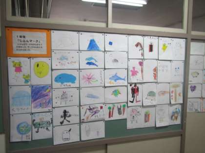 図工の時間に1年生がつくったマークが廊下に掲示されています。