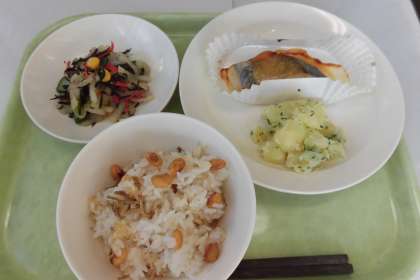 【献立】大豆とじゃこのごはん・魚のみそマヨネーズ焼き・パセリポテト 大根とひじきのサラダ・牛乳
