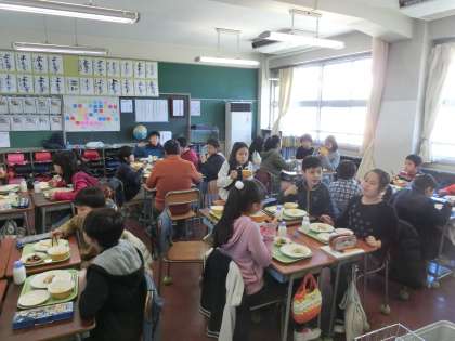 サギソウの植え方を教えてくださった地域の方々と一緒に給食を食べました。