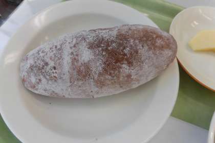 写真ではパンが白く見えますがこれはココアと粉砂糖を混ぜたものをまぶしたからです。子どもたちが食べるころは全体がココア色になりました。