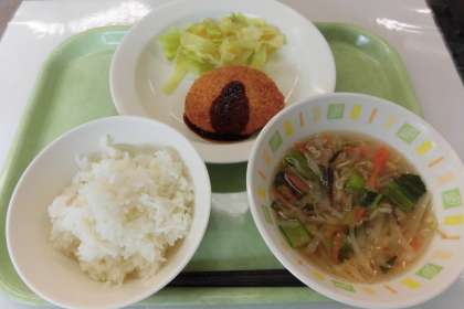 【献立】ごはん・おからコロッケ・キャベツのカレーピクルス・沢煮椀・牛乳