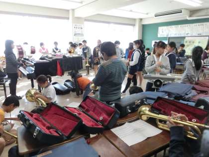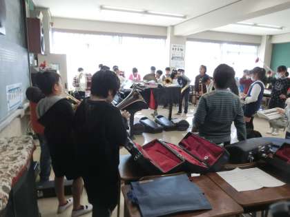 金管楽器、打楽器、旗などのパートに分かれて練習した後、全体で合わせて演奏を行いました。運動会や幕末維新祭の経験が生きているようです。