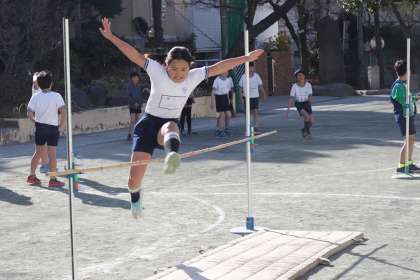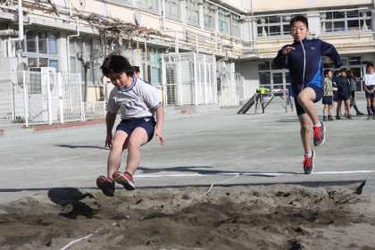 4年生は校庭での体育で、跳躍系競技に挑戦しています。