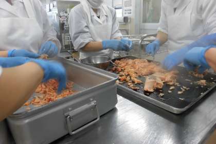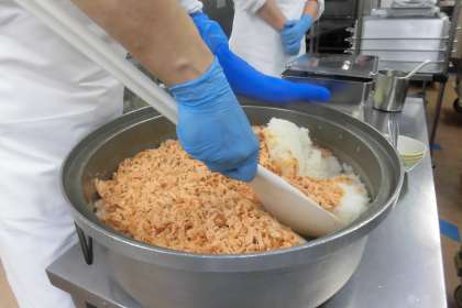 1.鮭がやけました。調理師さん全員で身をほぐします。身から湯気が立ちのぼっています。