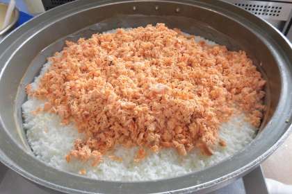 2.鮭のフレークが出来上がりました。炊飯釜に入れてごはんといっしょに蒸らします。