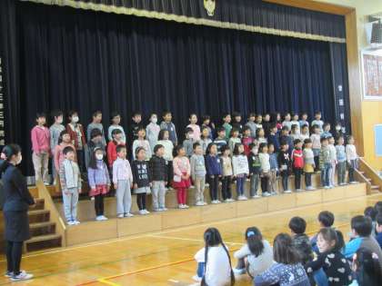 全校児童が集まった体育館内に1年生たちの暗唱「雨ニモ負ケズ」が響きます。