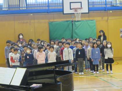 土曜日の「6年生を送る会」で全校合唱する歌の練習です。