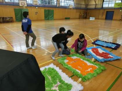 この時期は「卒業おめでとう」の言葉が体育館に掲示されます。