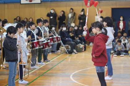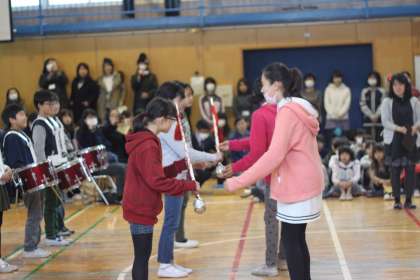 6年生の指揮者から、5年生の指揮者に、伝統の指揮杖が手渡されます。