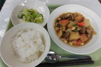 【献立】ごはん・豆入り筑前煮・野菜のひと塩・牛乳