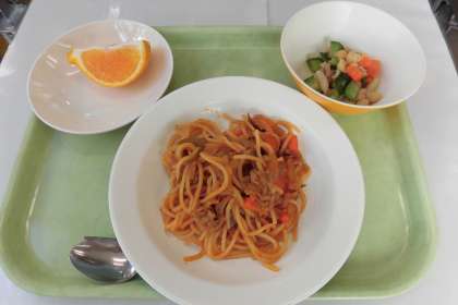 【献立】スパゲティーナポリタン・ビーンズサラダ・デコポン・牛乳
