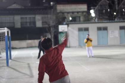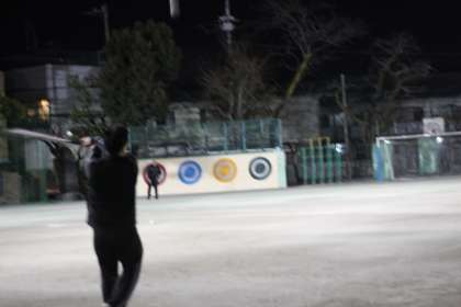 夜の校庭でPTAソフトボールの皆さんが練習をしています。