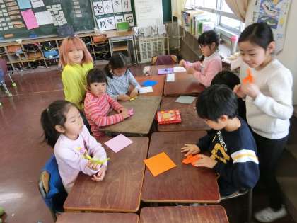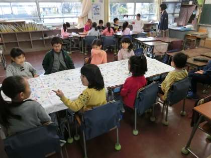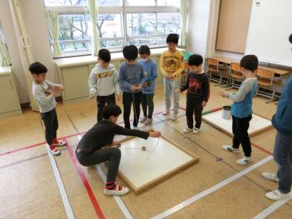 生活科で体験した昔遊びのコーナーをつくり、保育園の子達に楽しんでもらいました。