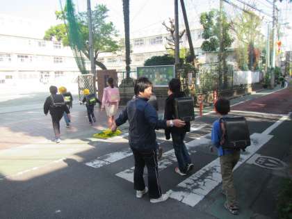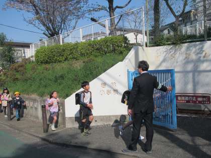 土曜日はスクールゾーンの交通規制がかからないため、主事さんに加えて先生たちも登校時の見守りを行っています。