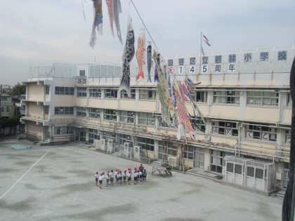 こいのぼりたちが見守る中、元気いっぱいの4年生。
