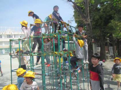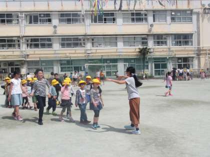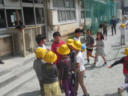 校庭のあちらこちらに見える黄色い帽子に、上級生たちも興味津々です。