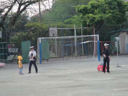 今日は世田谷警察交通課のおまわりさんが若小に来て、1年生を対象とした交通安全教室を開いてくれました。