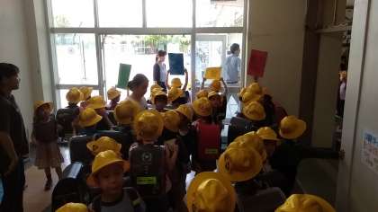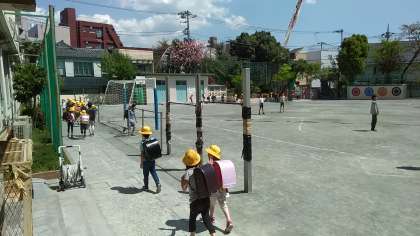 先頭の子がプラカードをもち、帰る姿もかわいい若小1年生。