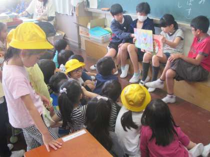 朝読書の時間に、6年生が1年生の教室で読み聞かせをしました。