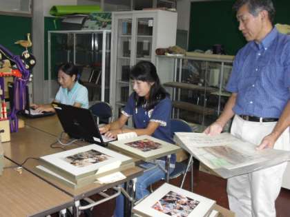 若林町会広報担当の月村さんの御協力で始まった郷土資料室の整備が、この夏休みで少しずつ進んでいます。夏休みは、学校中から集めた資料や書籍などを分類し、目録を作成しています。十数名の保護者の方も、お手伝いくださっています。中には、中学生も手伝い、若林小学校や若林町についての興味をもっていました。