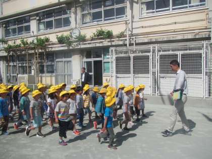 朝会が終わった後の行進も、3クラス一緒、6列で行います。