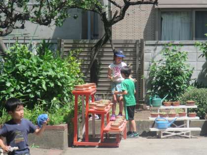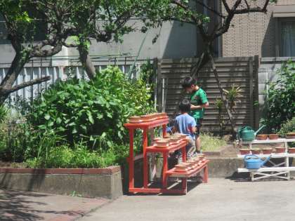 2年生が生活科の学習で、校舎北の学校菜園に来ています。