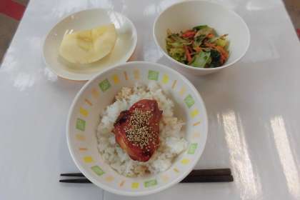 【献立】照り焼きどんぶり・キャベツの浸し・りんご・牛乳
