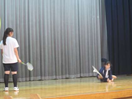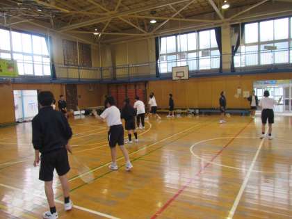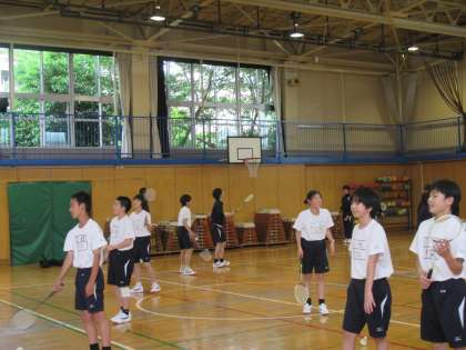 放課後の若小体育館で、同じ学び舎の世田谷中学校基礎トレーニング部の生徒さんたちが練習をしています。