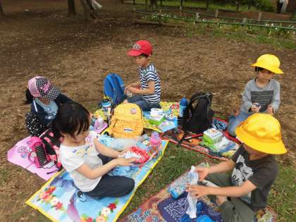 お弁当も班ごとに、1、2年生合同で一緒にいただきます。