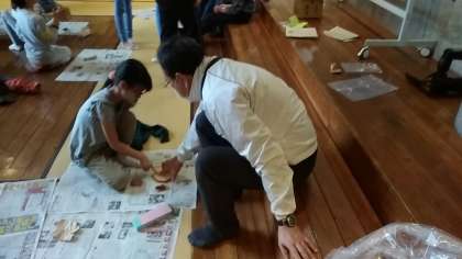 紙やすりを手にがんばる5年生たちを、校長先生も限りなく応援!