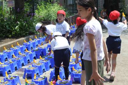 1年生は休み時間ごとに、アサガオのところに出かけています。