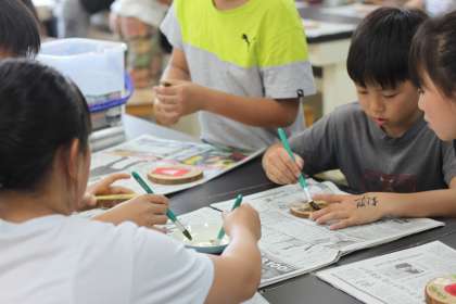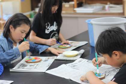 5年生が移動教室の時に作った木製コースターに、色を付けています。