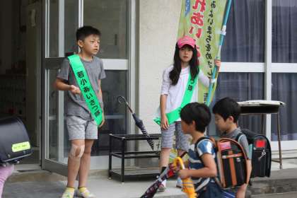 元気いっぱいのあいさつのみならず、1年生の傘のかたづけもお手伝いしてしまう5年生でした。