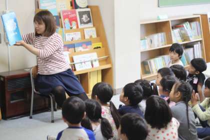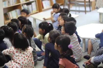 司書の先生から読み聞かせをしてもらい、興味深く聴き入っています。