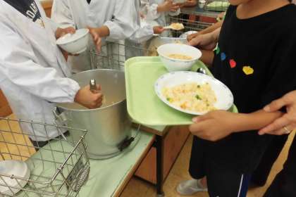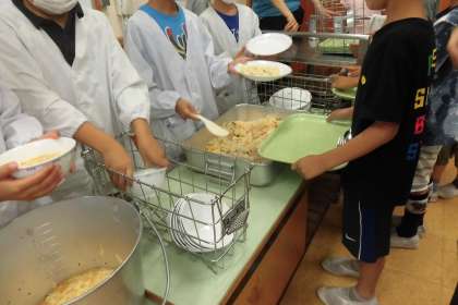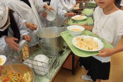 先月からランチルームでの給食が始まっています。今月は2年生以上のすべてのクラスが、日替わりでランチルームを使います。今年度からランチルームで食べるときは、強化磁器食器を使うことになりました。幾分緊張しながら配膳しているようすをご紹介します。