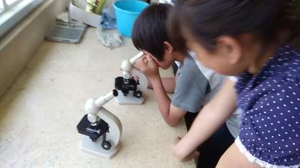 サンプルのプレパラートで、ハエの目やアサガオの花粉などを観て興味津々!