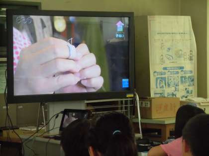 家庭科の学習で裁縫をしている5年生。