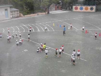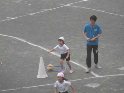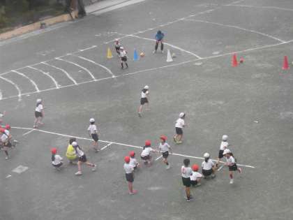 力いっぱい走る子どもたちを前に、実習生も嬉しそうです!