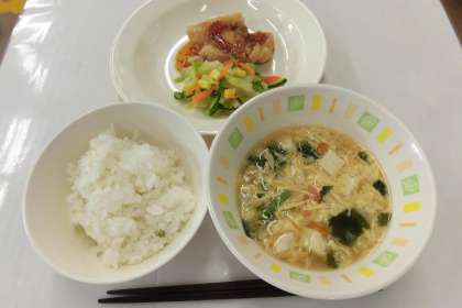 【献立】ごはん・とり肉のマーマレードソース・ゆで野菜・かきたま汁・牛乳