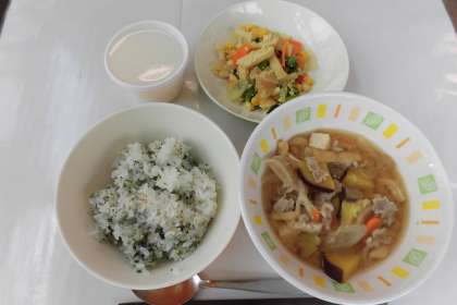 【献立】青のりごはん・高野豆腐入りサラダ・さつま汁・ホワイトゼリー
