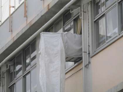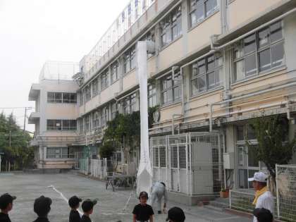 万が一の際に子どもたちの命を守る救助袋の点検です。