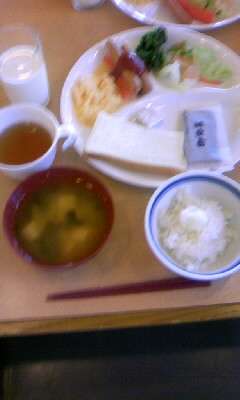今日の朝食はバイキングです。でも、数限定ですのでパンとご飯の和洋折衷です。群馬県産の牛乳が甘いと大好評です。昨日出た、ヨーグルトドリンクは川場産で、とっても濃い味でした。(7時46分)