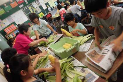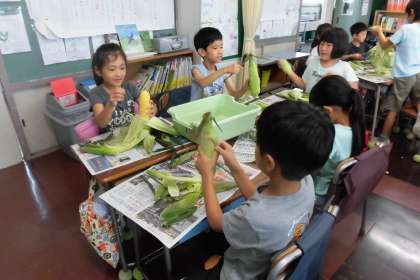 今日の給食に使われたトウモロコシは、2年生が向いてくれました。